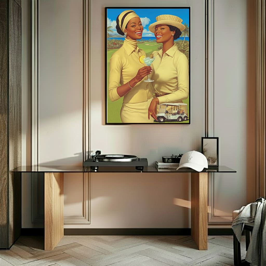 Cart Girls captures the sun-soaked joy of a perfect day. Two diva girlfriends sharing a bright cocktail and an even brighter laugh. Set against a lush tropical fairway, the scene is playful and glamorous all at once, blending resort-style elegance with the carefree spirit of a girls’ day out.