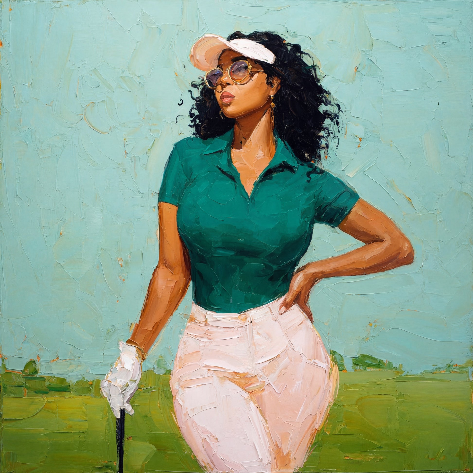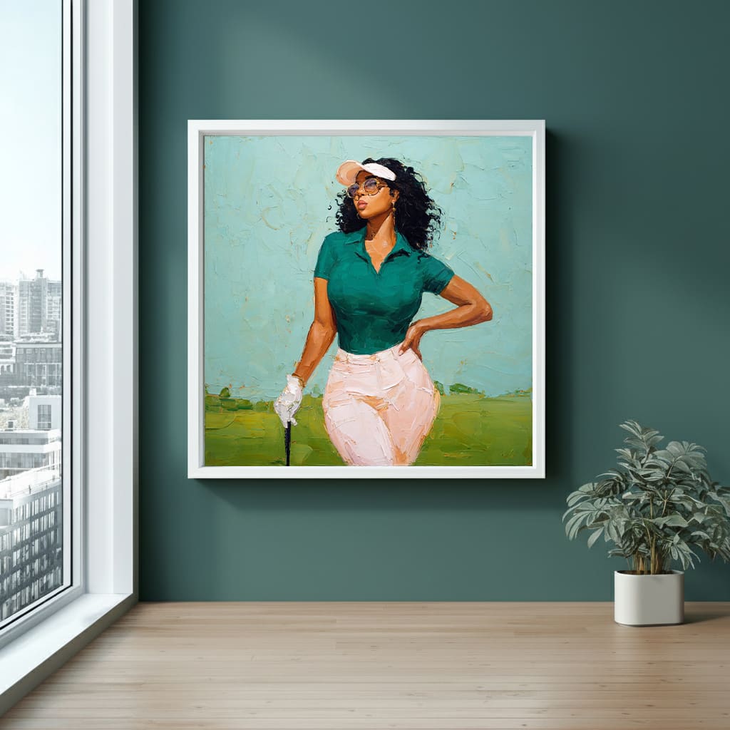 Confidence captures a golfer who radiates cool, effortless presence. Painted with thick, expressive strokes, the artwork balances soft pastel tones with her strong, confident pose. This piece celebrates style, self-assurance, and the unapologetic charm of a woman who owns the fairway.