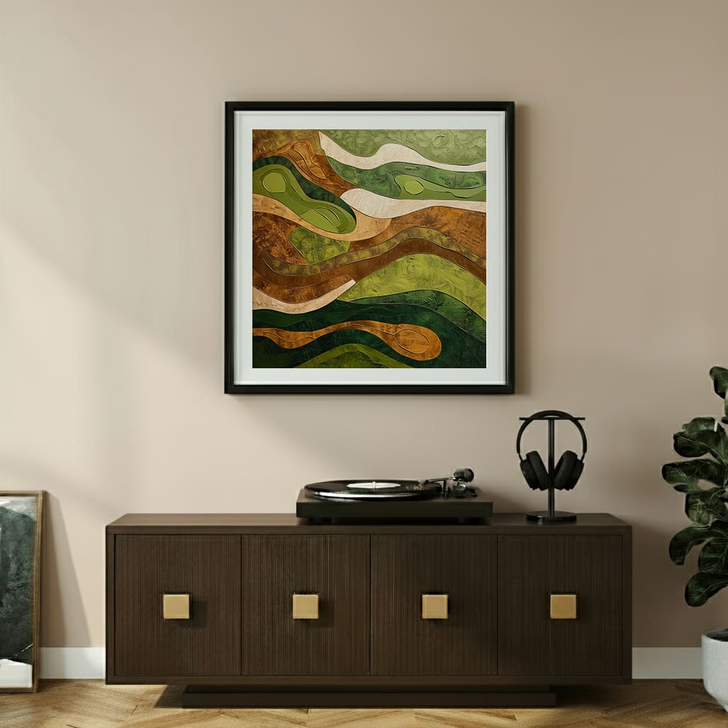 Contour 2 reimagines the textures and curves of the course through shape and color. Greens become rounded islands, fairways stretch into elongated ribbons, and sand cuts through the composition in confident strokes of warm contrast. Contour 2 is part of the contour 4 collection.