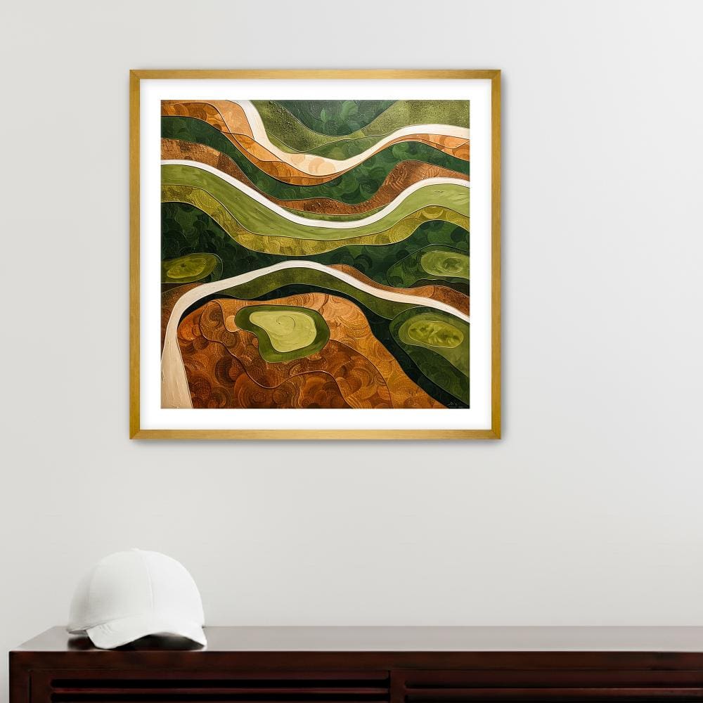 Contour reimagines the textures and curves of the course through shape and color. Greens become rounded islands, fairways stretch into elongated ribbons, and sand cuts through the composition in confident strokes of warm contrast. This print is about structure and flow, less about course clarity. Contour 4 is part of a four image collection.